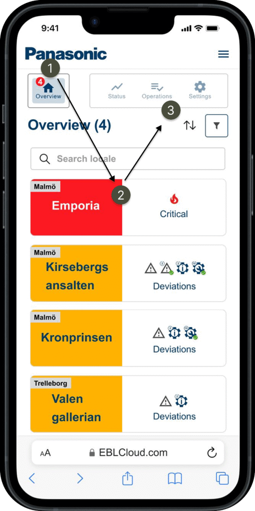 1. The overview displays four sites, where Emporia is marked as critical with a fire icon. He clicks on it and proceeds to: