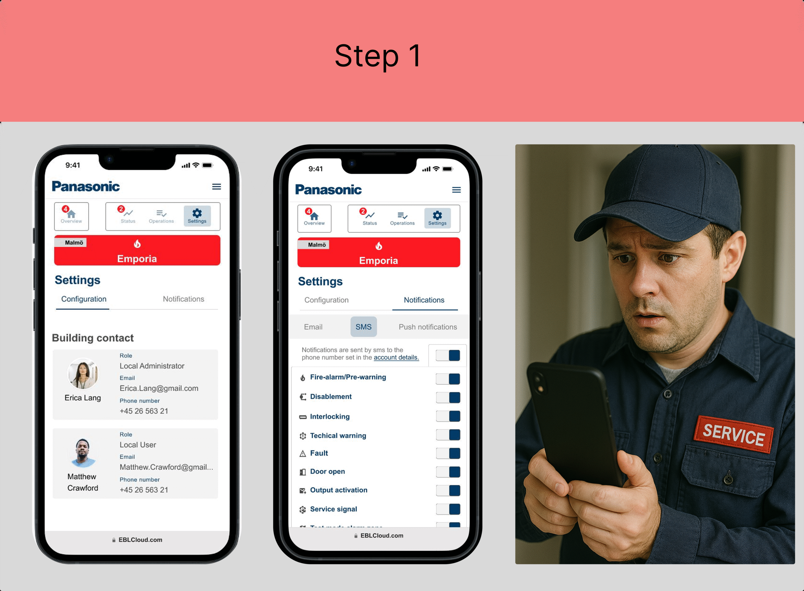The fire technician Matthew is contacted by the local manager Stefan and is informed about the alarm.