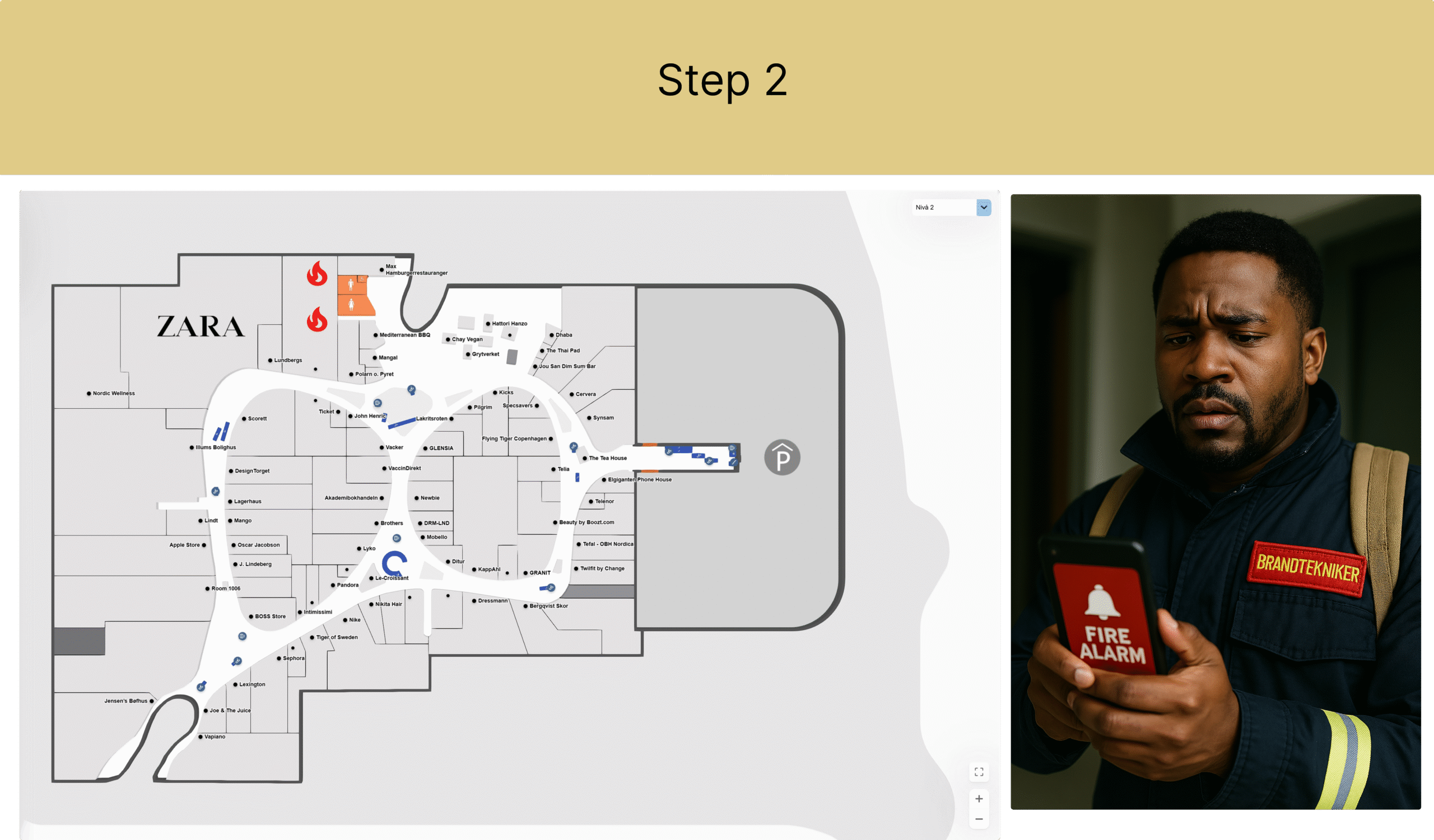In the map view, he sees that the alarm originates from the Food Court near the restroom area. Two fire detectors have identified smoke. Matthew confirms the incident in EBLCloud and heads to Emporia to handle the alarm.