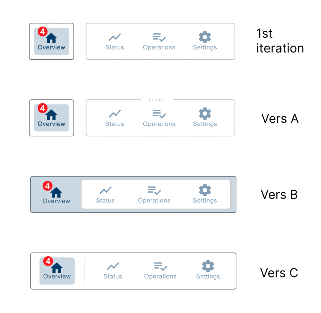As shown in the picture, the shortcuts (number 3) for each locale wont be highlighted and active until a locale has been chosen. My approach to this matter was to separate the ”Overview” button with the rest, but the challenge still remains. My next step would be trying new designs and prototypes for the navigation bar to see if this challenge can be overcomed. I started sketching and came up with the following designs;